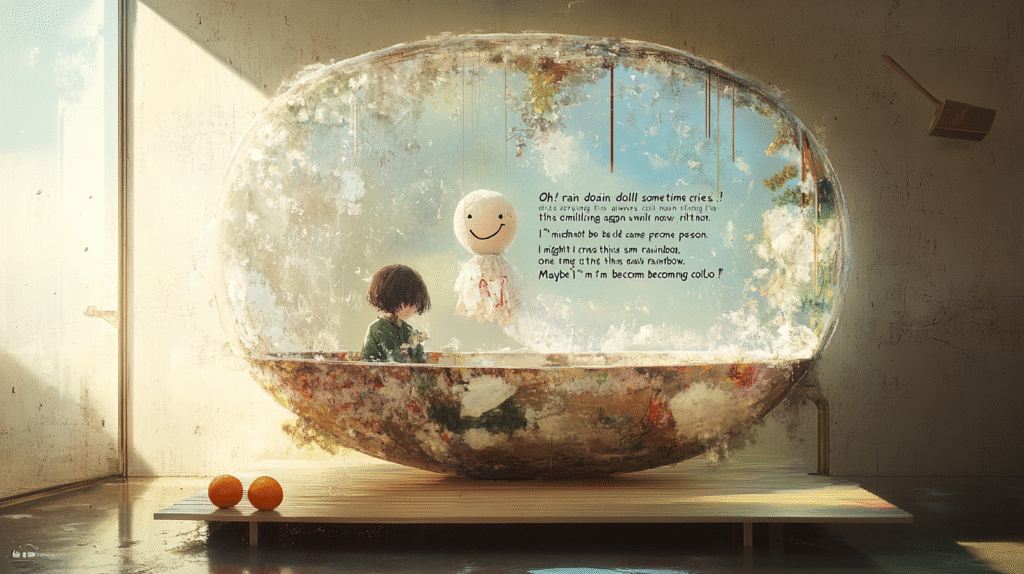 だから、妹が作るてるてる坊主はいつも笑顔で、雨で顔がぐしゃぐしゃに濡れるたびに、「あ!また泣いちゃってるから、私が笑顔にしてあげよう!」とニコニコしながら新しいてるてる坊主を作るのです。