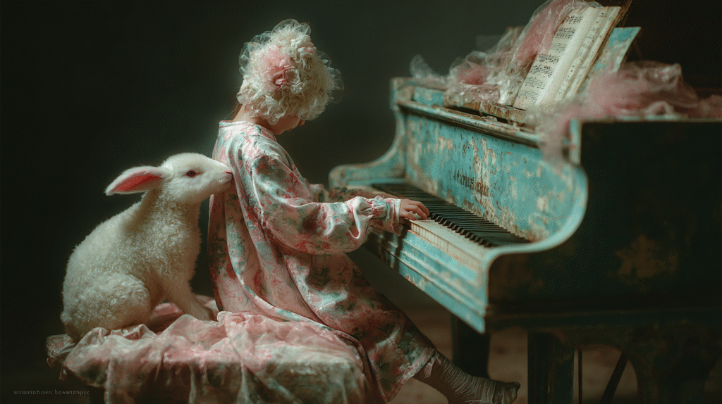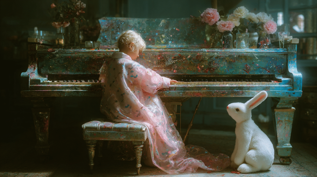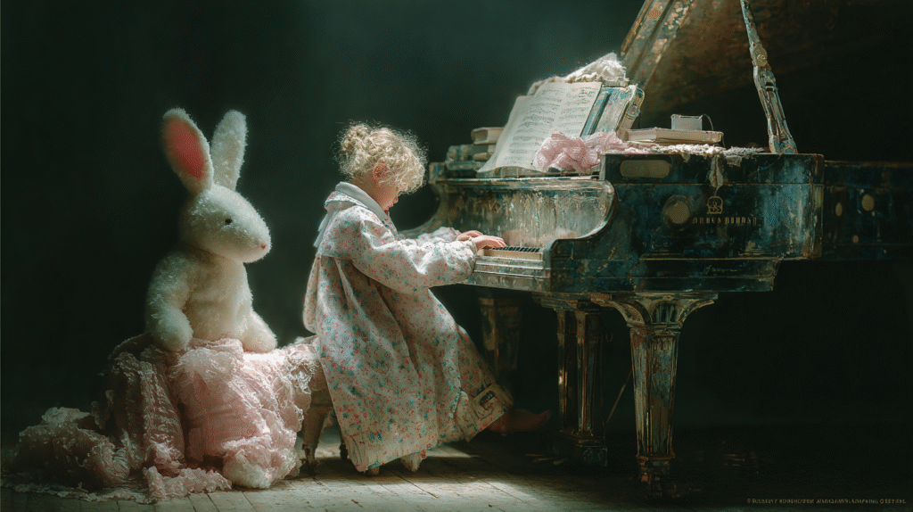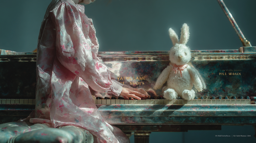 白いウサギのぬいぐるみは服を着ていて、その服の柄はピアノに掛けられている布と同じ柄で、ピアノが好きな女の子はこのウサギのぬいぐるみも大好きなので、練習を始める時はいつもそばにウサギを置いて、自分の演奏を聴いてもらっているのです。