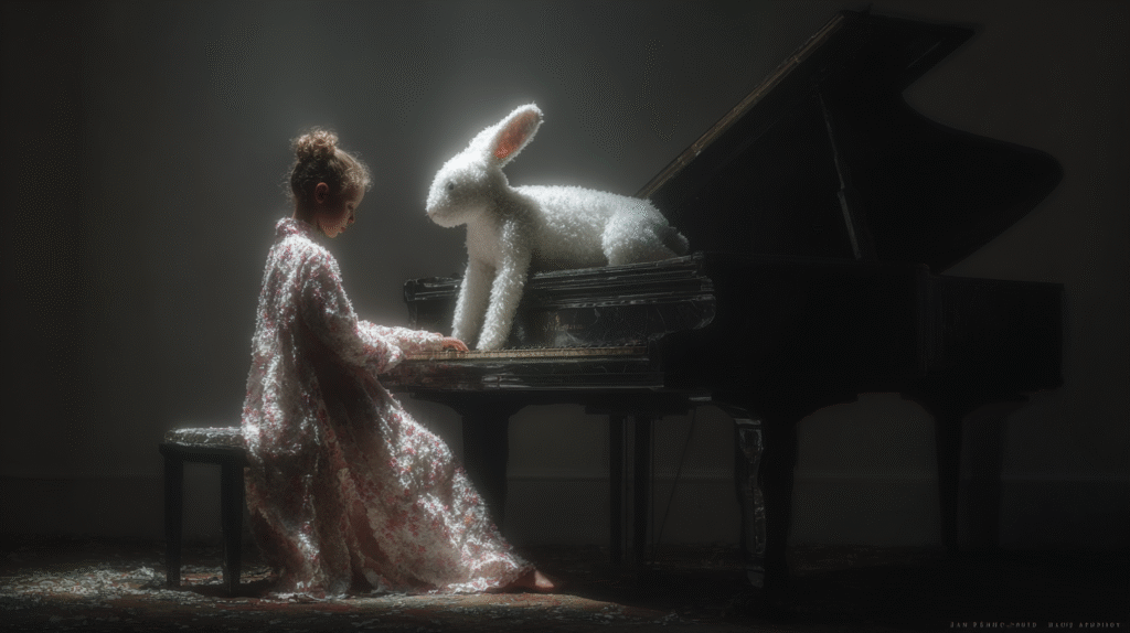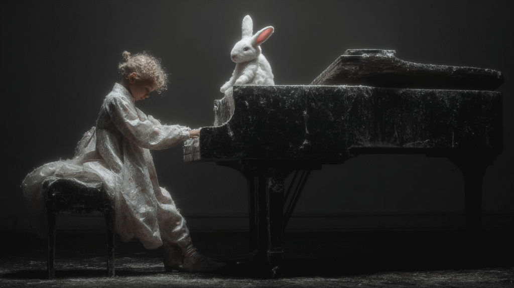 そうやって、ウサギとともにピアノの練習をする時間は女の子にとってかけがえのない時間で、ウサギがいるから難しい楽譜が読めるし、ウサギがそばで練習を見てくれているから、女の子は何度音を間違ってもめげずにお暗示フレーズを練習することができるのです。