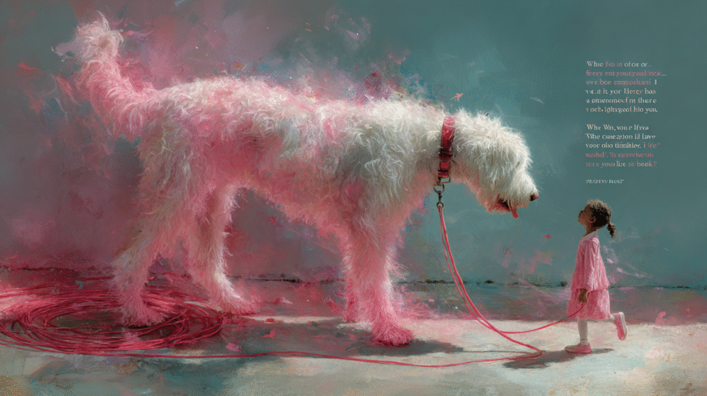 ある日、大きな台風が犬と女の子が住んでいる家を襲って、窓ガラスがガタガタ揺れて、窓の外は灰色の分厚い雲と、横殴りの大粒の雨が窓ガラスを叩きます。