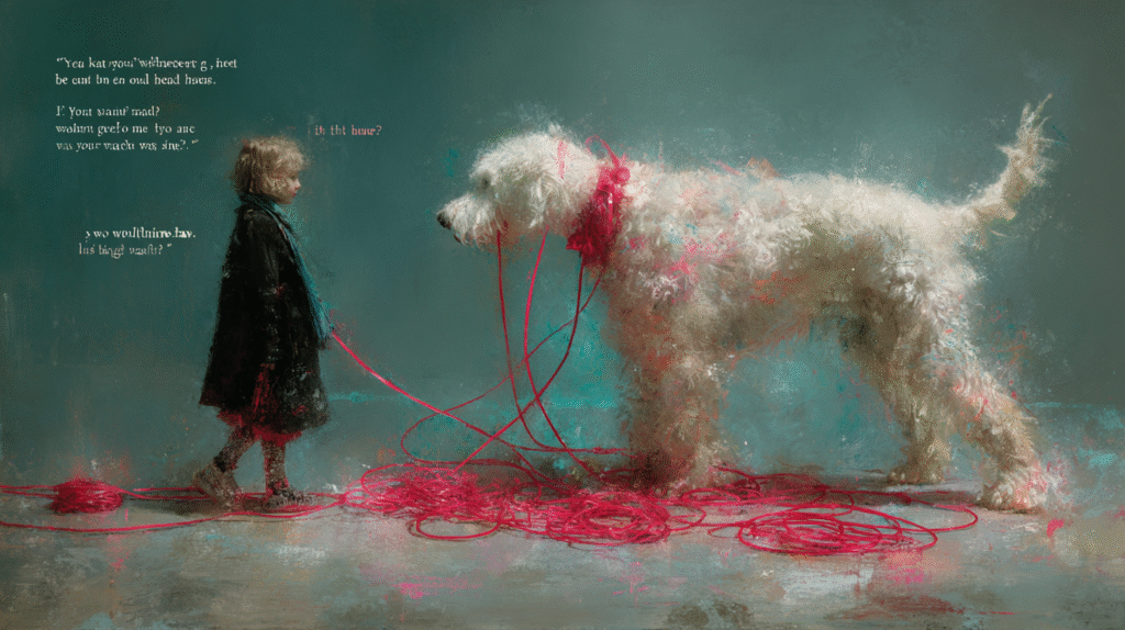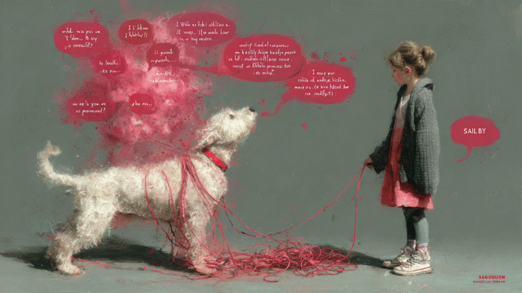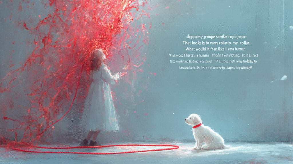 だけど、犬は「縄跳びの縄」を知らなかったので、赤くて長いロープのような物体を見た時に「自分の首輪と似てるなあ」と思いました。