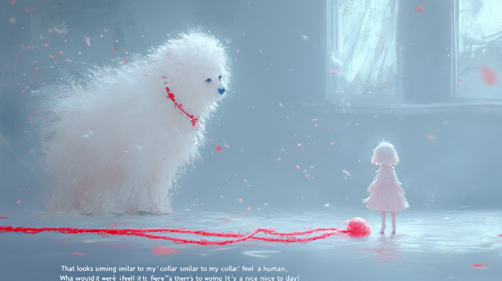 白いもふもふした犬が、赤い首輪をしていて、女の子と一緒に散歩に出かけています。