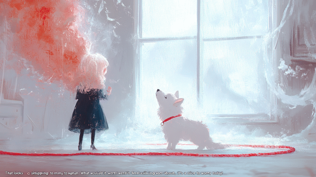「今日はいい天気だね!」と言う女の子は、犬にとっては変わらない日常で、先ほどまでの嵐を「どうしてあんなに恐れていたんだろう」と、明るい陽射しを窓越しに浴びながら、女の子とともに窓の外を眺めるのです。