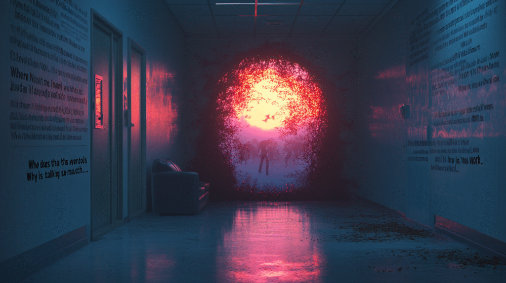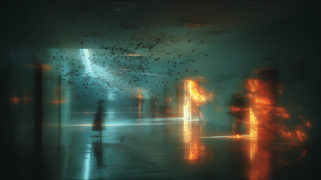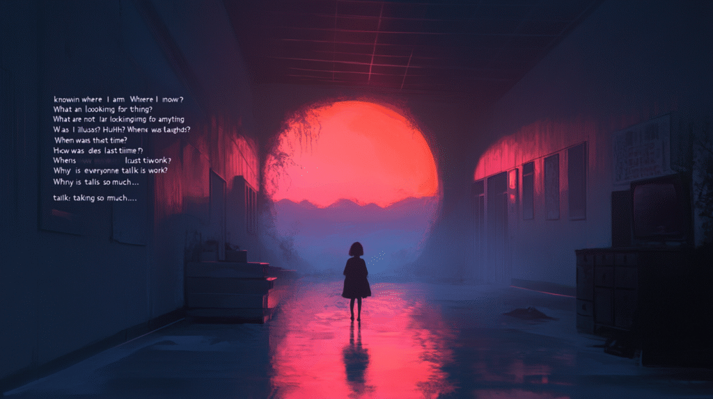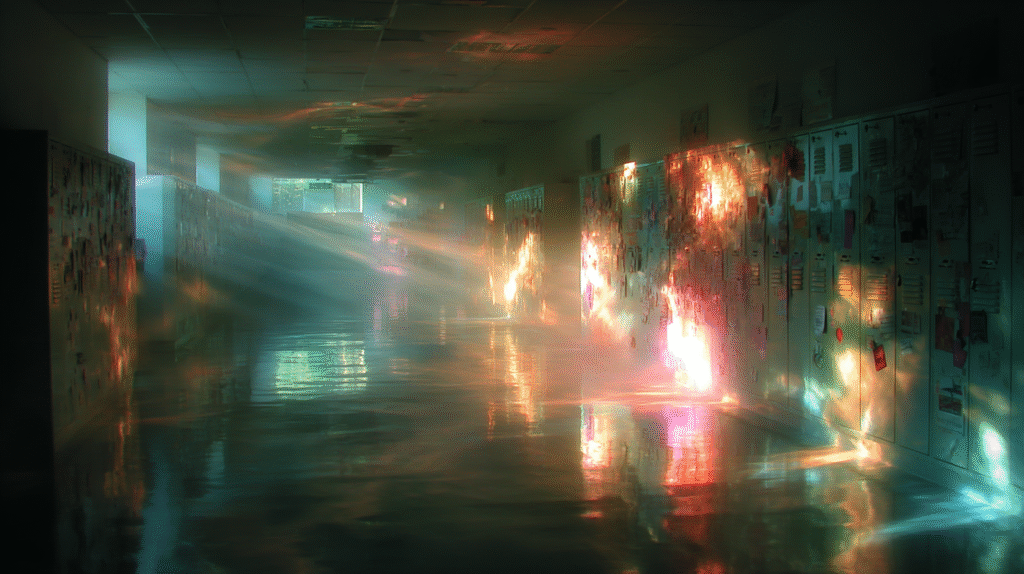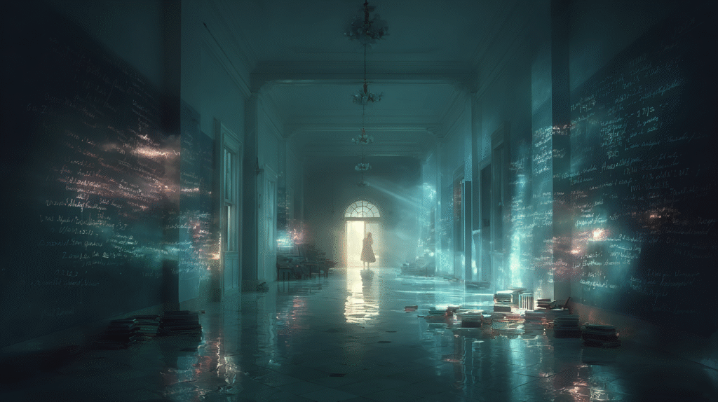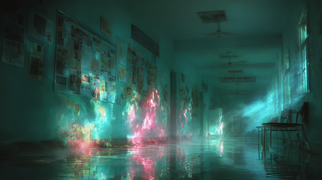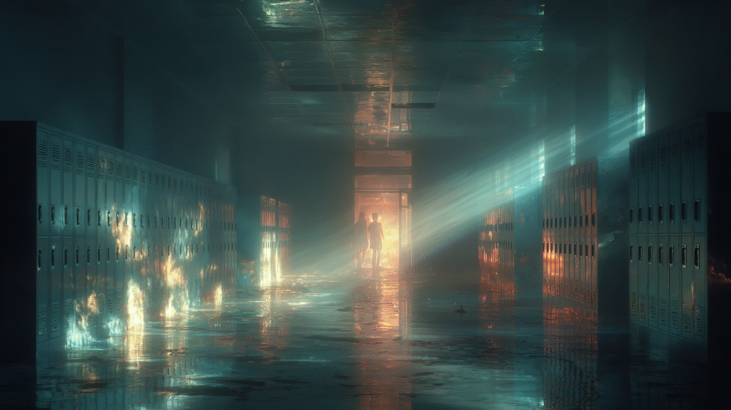 学校の暗い暗い廊下がまっすぐ目の前に続いていて、ここは「学校なんだ」ということが分かります。