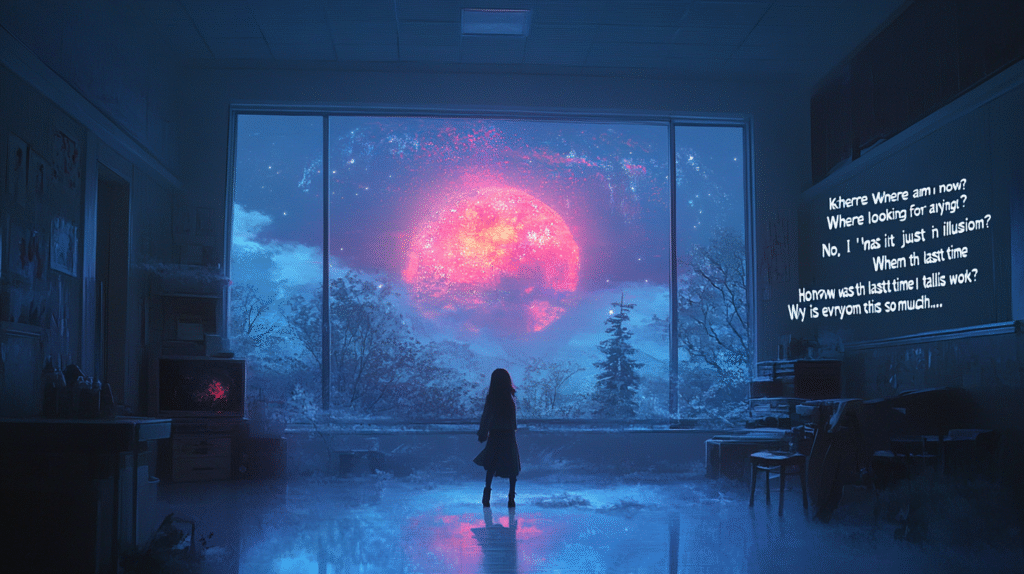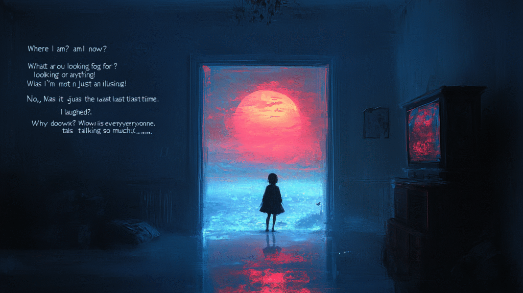 あちらとこちらの世界で…たとえば、先ほど廊下から見た大きくて真っ赤な夕陽と、暗い廊下と同じように、私の母親の後ろ姿とテレビの中の世界は、違う光や違う音を放っているように見えるのです。
